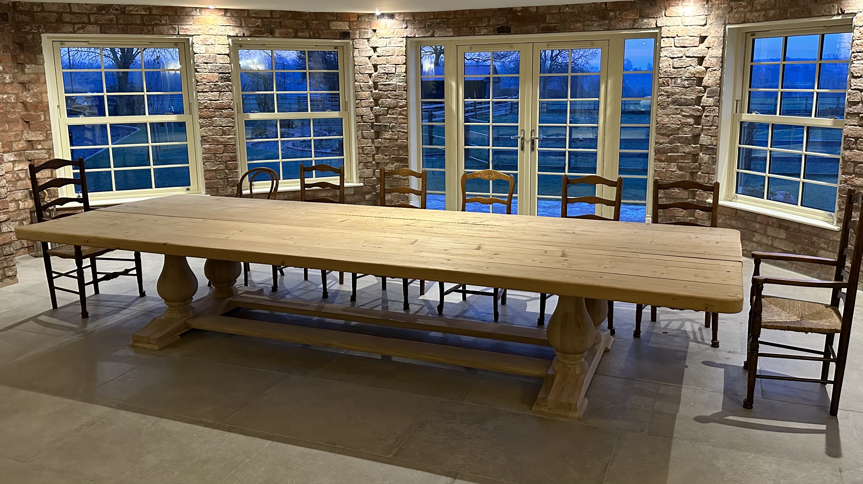 Here is a finished table using a huge "double end double pedestal' base in Oak, the finished table measures 4.2m x 1.5m.
